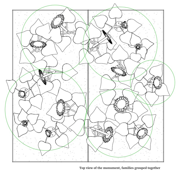 The sunflowers are placed in a circle, in a spot always touched by sunlight, allowing people to gather around them during ceremonies or quiet moments.